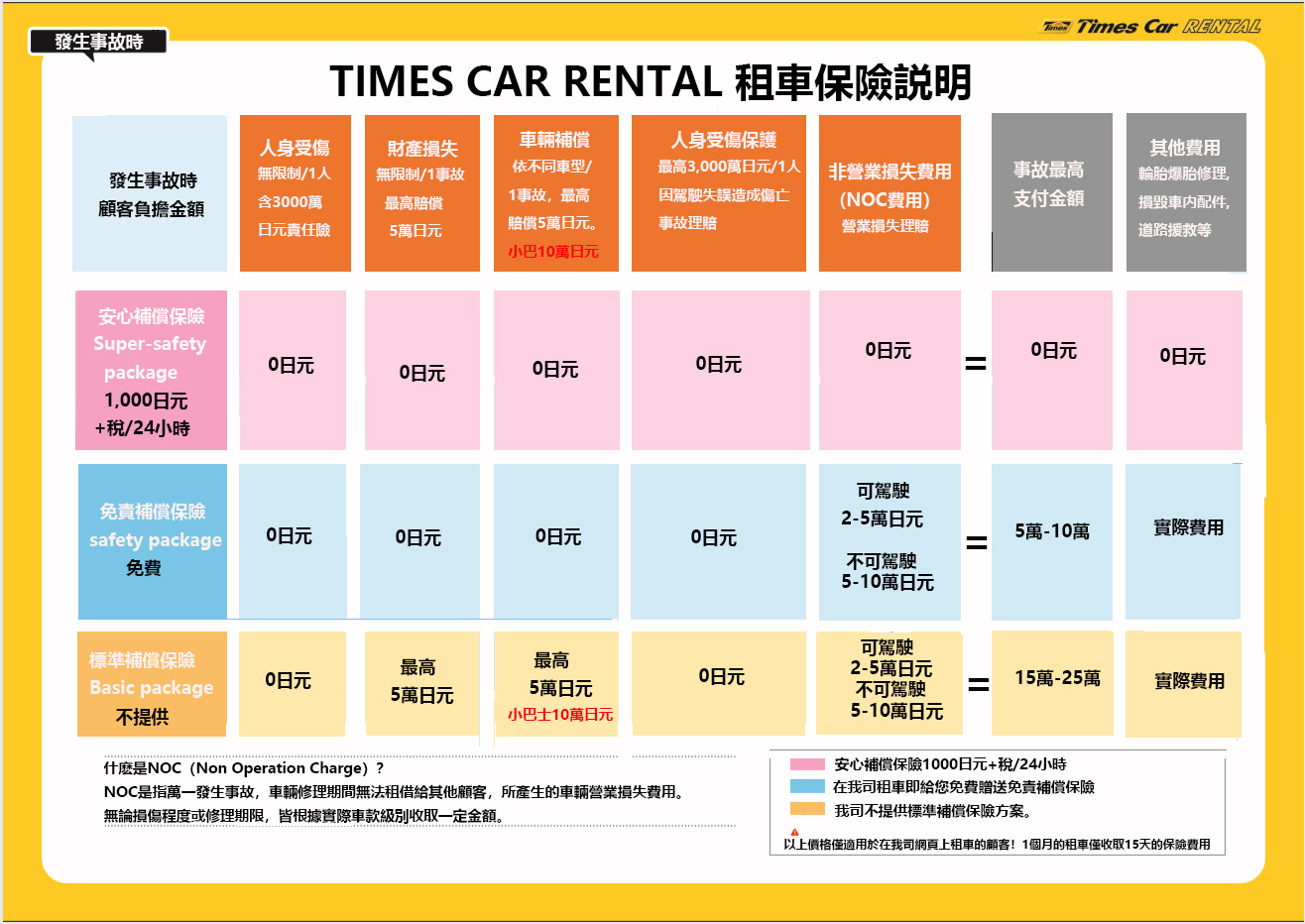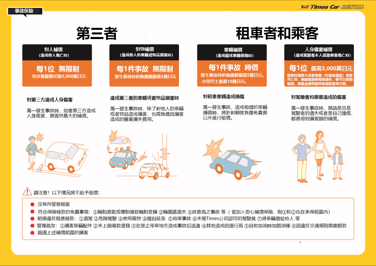 出发前 支付加入免责补偿保险费用、 发生事故时 负担金额为0日元。 对物最高赔偿5万日元,车辆最高赔偿5万日元( 小型巴士、 普通货车、 特殊用途的车辆 最高赔偿10万日元)